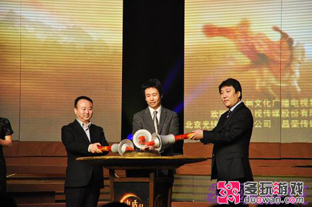 《画皮Ⅱ》电影、网游、手游“三屏合一”启动仪式(左起麒麟影业CEO庞洪、麒麟游戏CEO尚进、麒麟无线CEO梁浩)