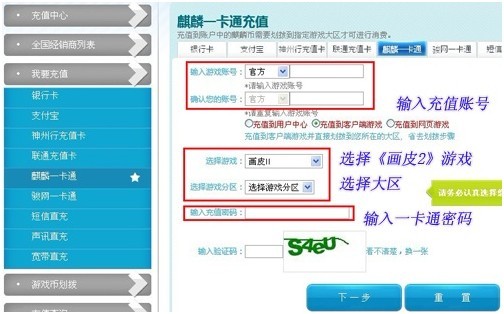 第二步:在相关页面中一次填写您所想要充值的游戏账号、充值信息、“麒麟一卡通”密码以及验证码,确认无误后点击下一步;