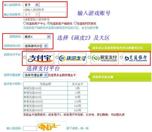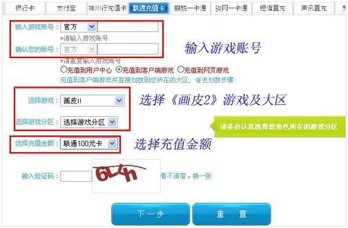 《画皮2》也为您提供了第三方充值卡充值服务,本服务涉及:“神州行充值卡”、“联通充值卡”及“骏网一卡通”。当使用这些充值卡充值时,您可以通过以下三步完成充值操作: