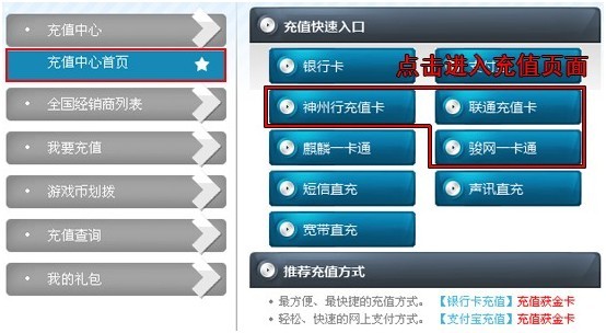 第一步:登录麒麟游戏官网充值中心,并选择“神州行充值卡”、“联通充值卡”、“骏网一卡通”选项。