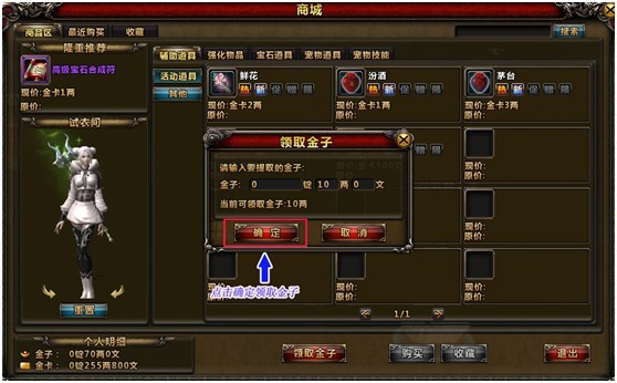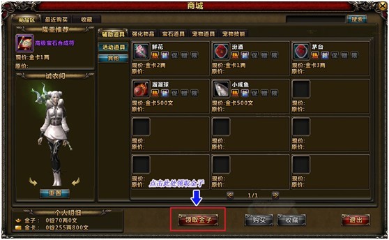 领取现金:通过以上渠道充值成功后,进入游戏,点开游戏右上角小地图中的【商】字按钮,打开游戏商店,并在界面中点击【领取金子】即可成功获得充值的游戏金子。