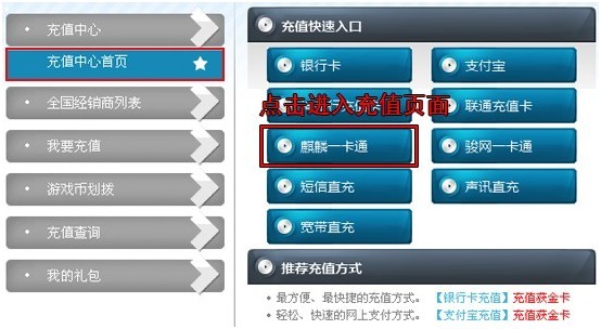 第一步:登录麒麟游戏官网充值中心,并选择“麒麟一卡通”充值按钮
