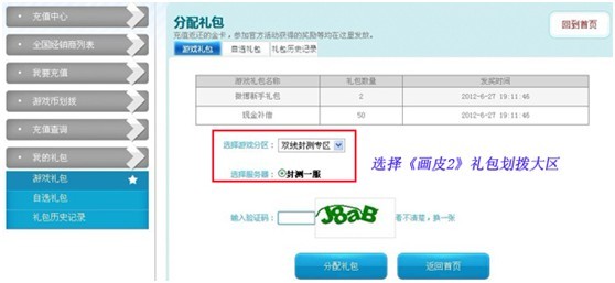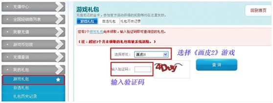 第二步:选择“游戏礼包”,在右侧对话框中选择《画皮2》并输入验证码