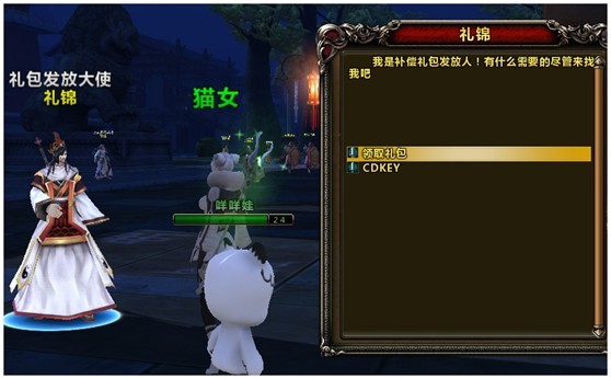 到【江都】礼包发放大使“花儿”(坐标:1540,1689)或【鬼城】礼包发放大使“礼锦”(坐标: 2044, 2993)处对话领取礼包即可。