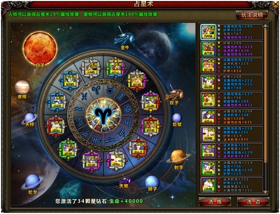 温馨提示:人物可以获得占星术20%属性效果加成,宠物可以获得占星术100%属性效果加成!