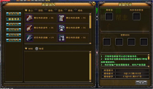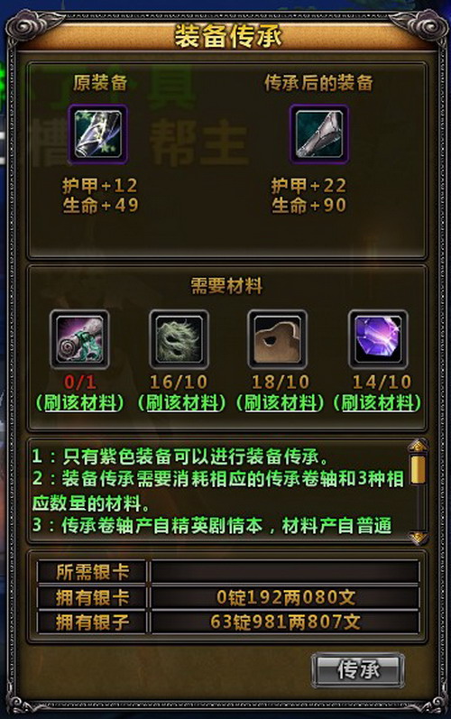 2:装备传承需要消耗相应的传承卷轴和3种相应数量的材料。