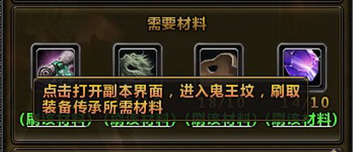 - 点击【传承】按钮为装备传承。装备传承需要材料可按照材料下方提示进行获取。