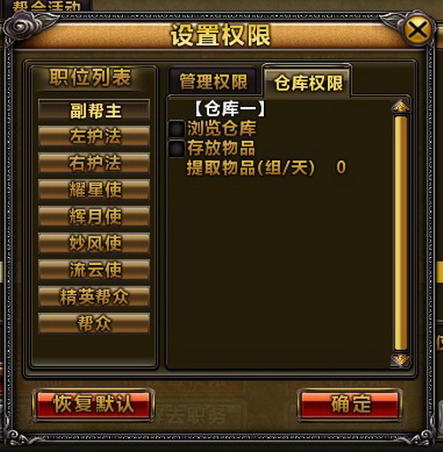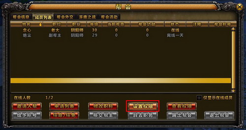 帮主可以通过该功能为帮会内不同职务的人设置不同的管理权限。
