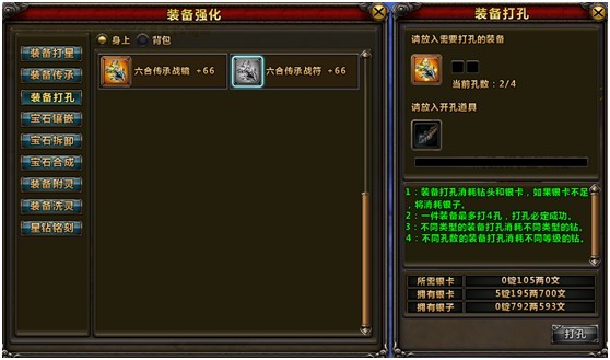 温馨提醒: 1:装备打孔消耗钻头和银卡,如果银卡不足,将消耗银子。 2:一件装备最多打4孔,打孔必定成功。 3:不同类型的装备打孔消耗不同类型的钻。 4:不同孔数的装备打孔消耗不同等级的钻。