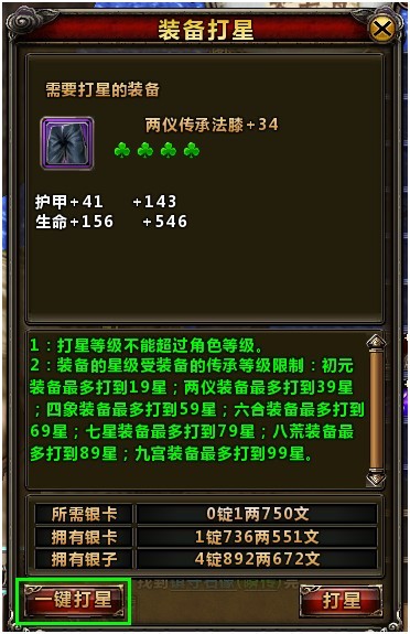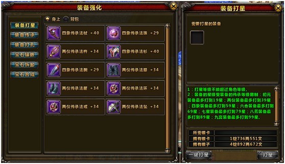 装备的星级受装备的传承等级限制:初元装备最多打到19星;两仪装备最多打到39星;四象装备最多打到59星;六合装备最多打到69星;七星装备最多打到79星;八卦装备最多打到89星;九宫装备最多打到99星。