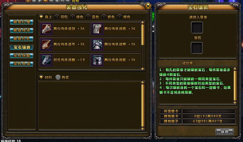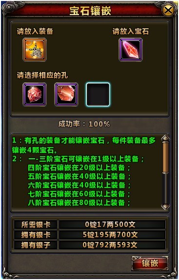 温馨提醒: 1:有孔的装备才能镶嵌宝石,每件装备最多镶嵌四颗宝石。 2:每件装备只能镶嵌一颗同类型的宝石。 3:不同类型的装备镶嵌对应类型的宝石。 4:每次镶嵌消耗一个宝石和一定的银卡,如果银卡不足将消耗现银。