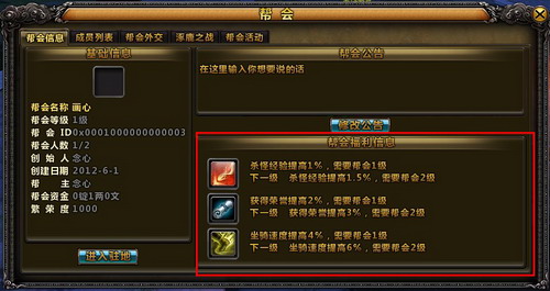 玩家加入帮会会有杀怪经验、荣誉提高、坐骑速度的福利加成,帮会等级越高福利越高。