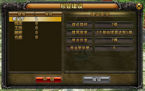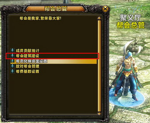 帮会建设包括“帮会驻地”、“帮会建筑”、“建筑升级”是帮会发展的重要基地,玩家游戏中部分道具的获取和活动都在此处完成。