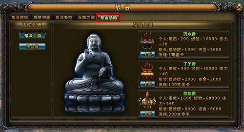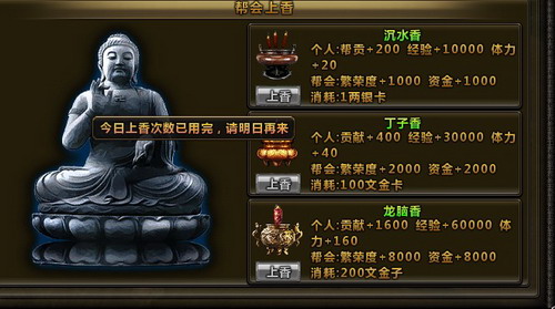 帮会上香消耗自己部分银卡、金卡、金子,为自己获得大量经验、体力、帮贡。