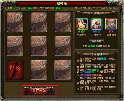- 重开一轮:如果玩家对本轮的翻牌奖励或者面具种类不满意,可以选择【重开一轮】,则原有的翻牌奖励和面具种类将被重置,玩家将进行重新一轮的翻牌,每重开一轮翻牌,玩家都将按顺序由一搜、二搜、三搜依次翻牌。
