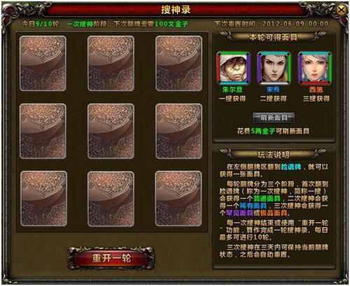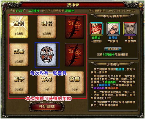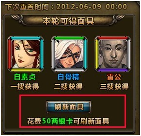 - 刷新面具:如果玩家对本轮搜神的面具奖励不满意,可以花费银币来刷新面具,刷新后,奖励的三张面具将被随即重置为新的三张面具。