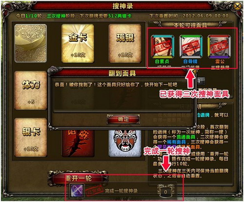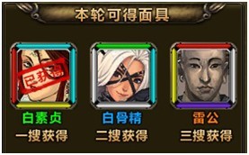 - 面具:在界面右上角的面具区,显示当轮搜神可以获得的3张面具,面具将按照品质由低到高排列,其中第一次搜神可以获得第一张面具,第二次搜神可以获得第二张面具,第三次搜神可以获得第三张面具。当玩家搜到该面具时,该面具上将盖有【已获得】印章。