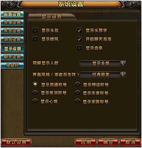 可以自行调节是否显示头盔、披风、头顶的帮会名称以及各种称号