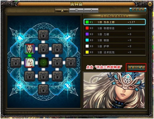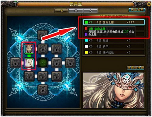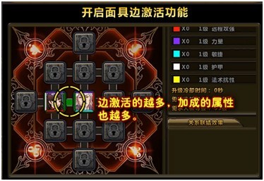 面具按照其在面具盘中不同的排列组合方式有按能量条激活排列与按关系激活排列两种,每一种激活都将造成玩家属性值的提升效果。