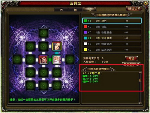 4. 联边激活升级:只有地盘、人盘的联边激活才能升级,每种效果类型都有10个等级,玩家可以点击【升级】按钮,使选择的效果升级。升级后该效果会提升1个等级。