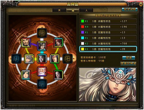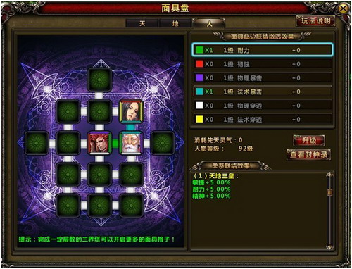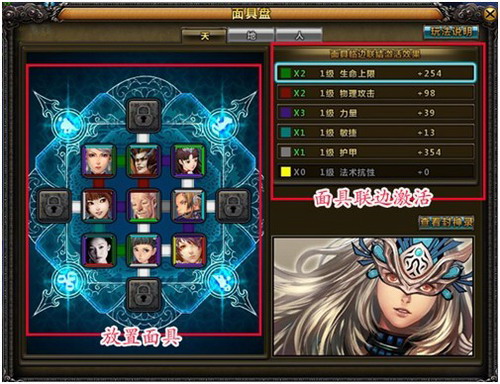 面具盘的级别由低到高共有3个分类:天盘、地盘和人盘。需要逐步开启,只有玩家将上一级面具盘中的面具槽全部打开,下一级的面具盘才会开启。面具盘主要由两部分组成,左侧为面具放入槽,右侧属性激活奖励框。