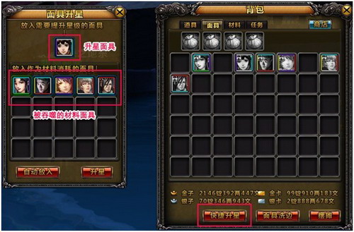 玩家在游戏中可以通过“快速升星”玩法,让一张面具同时吞噬多张面具,从而达到迅速提升该面具大量经验的效果。