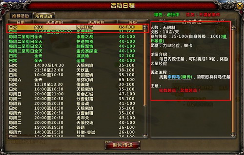 查找循环任务:玩家除了在各地图的NPC处接取任务外,还可以通过查看活动日历面板来快速查找当前可接取的循环任务,并快速完成任务。