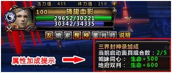- 当玩家开启了封神称号后,在头像下方将点亮【谱】字图标,将鼠标移动到该按钮,将会显示当前所激活的全部封神称号所带来的属性提升提示。