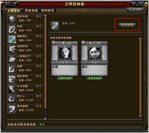 - 选择你想要激活的称号,界面右边显示该称号需要的面具组合,点击【放入面具】按钮
