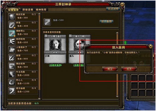 - 玩家左键、右键点击“面具选择背包”中的面具,均会执行放入面具操作,此时系统将提示执行此操作后,所放入的面具将从背包中删除