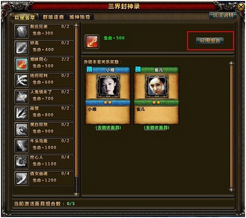 - 将符合条件的面具全部放入后,【放入面具】按钮将变为【启用组合】按钮,点击【启用组合】按钮,开启此组合称号的激活作用