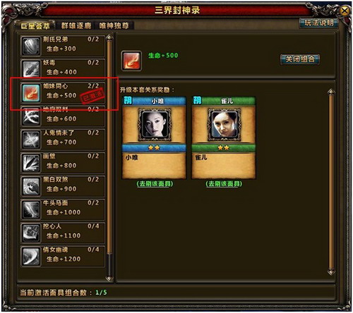 - 如上图所示,界面左侧为一系列不同的封神称号,如“荆氏兄弟、妖毒、姐妹同心”等,每一个称号都需要放置相应的面具组合才能激活,以“姐妹同心”称号举例,该封神称号需要“小唯”和“雀儿”两张面具搭配放入,即可激活