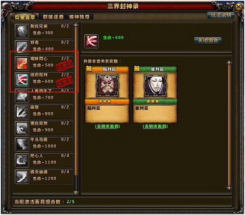 - 玩家可以同时激活多个封神称号,但上限为五个,如下图玩家同时激活了“姐妹同心”和“地府双判”两个称号,则获得了两个称号的属性提升